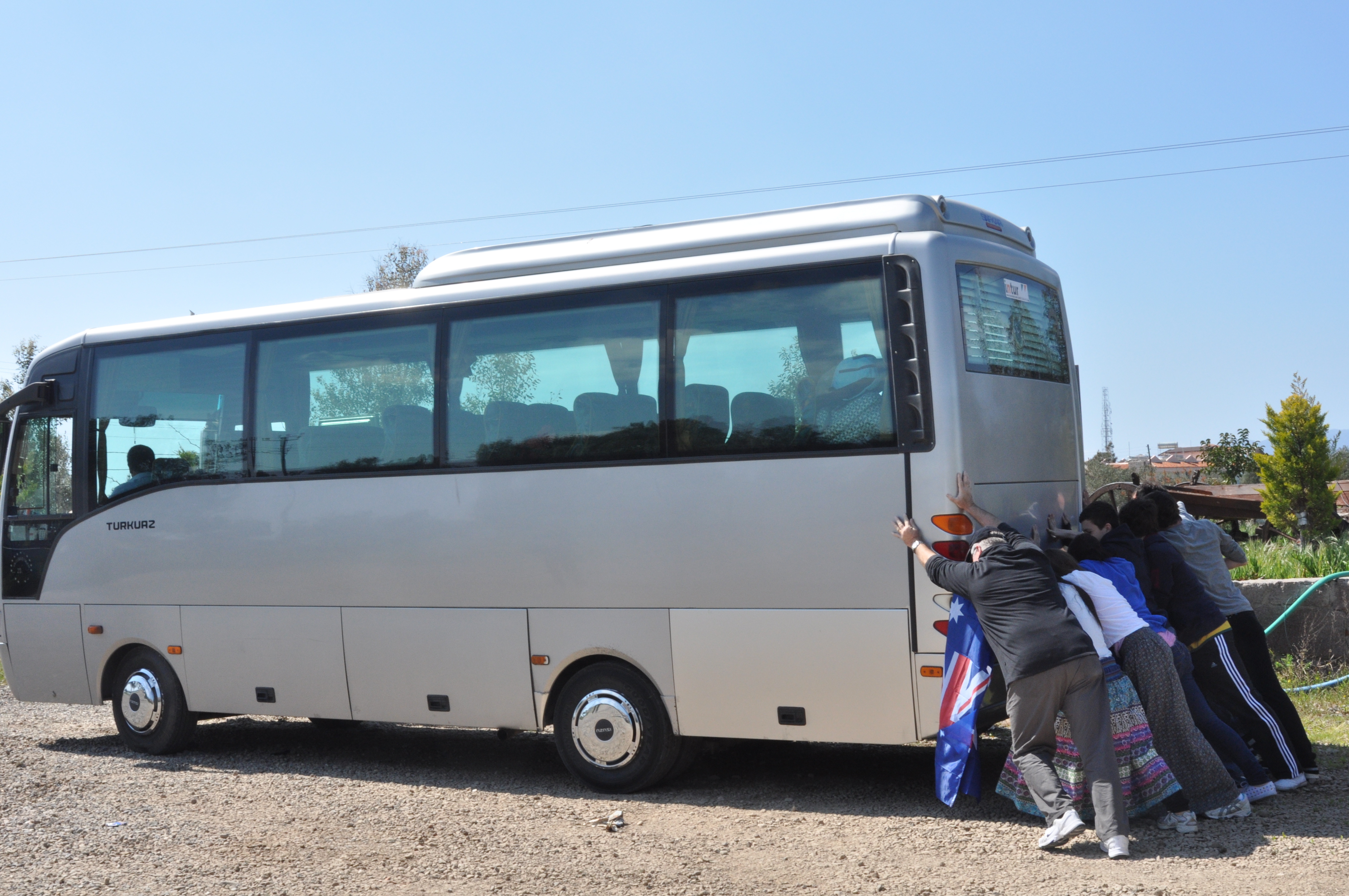 I personally think the bus was tired and annoyed because the teenagers were begging to be taken to town (the hotel sat along the sea). The driver, who was also thoroughly annoyed at the teenagers, said that they only way they could get the bus started was, well, to push it. So they did (to the amazement of all!). The rest of us just sat back with a drink, cameras at the ready, and watched the spectacle!