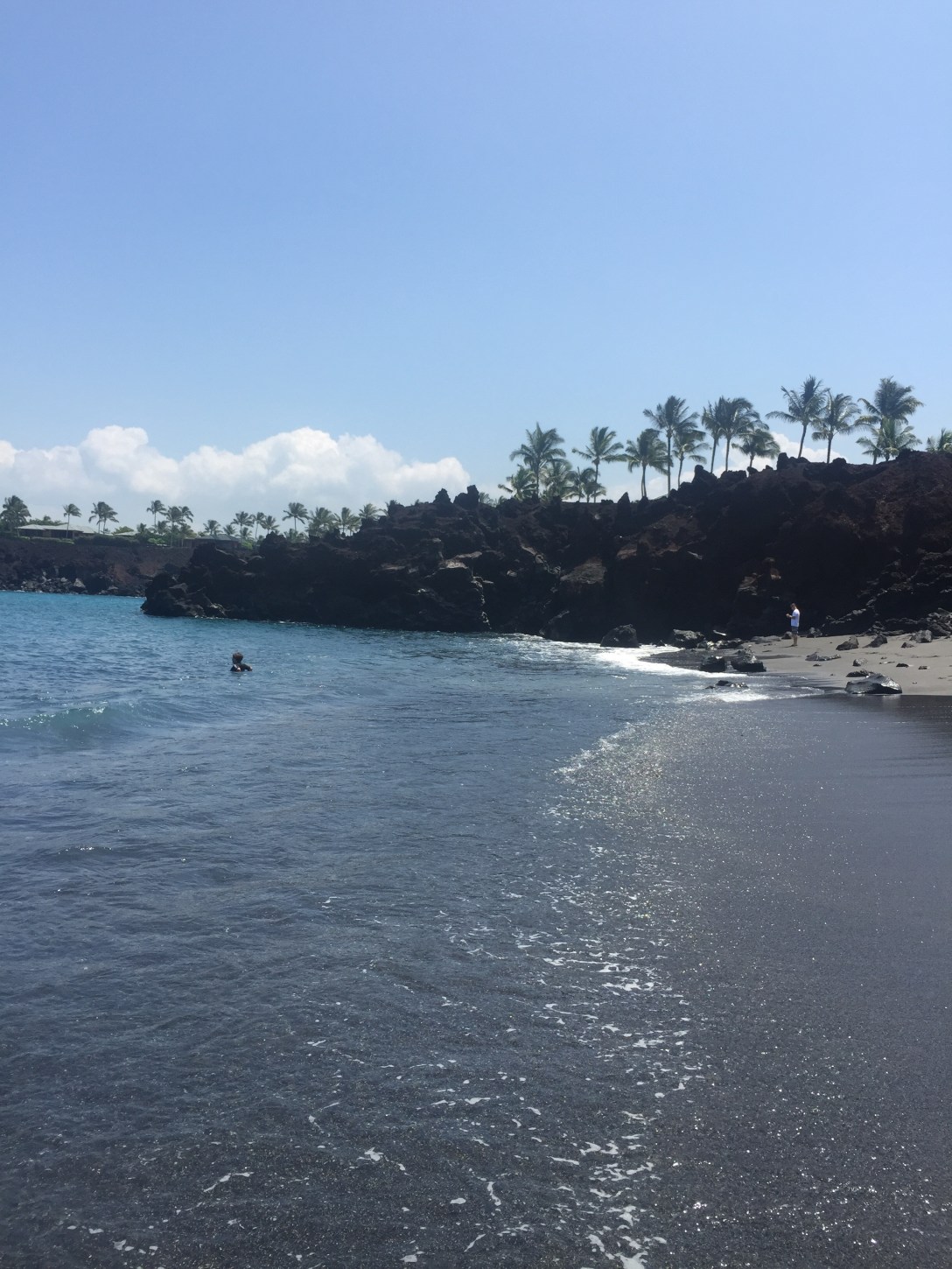 If you’re saying to yourself : “Self, that sand sure looks black,” you would be correct! It is, in fact, a black sand beach (which shouldn’t surprise any one who read Pilgrimage to (Coffee) Mecca). But here’s a fun fact that might surprise you about Hawaii: all beaches are public. ALL OF THEM. It doesn’t matter if they are on a military base or in a fancy gated community, they all have to have public access. ALL OF THEM.